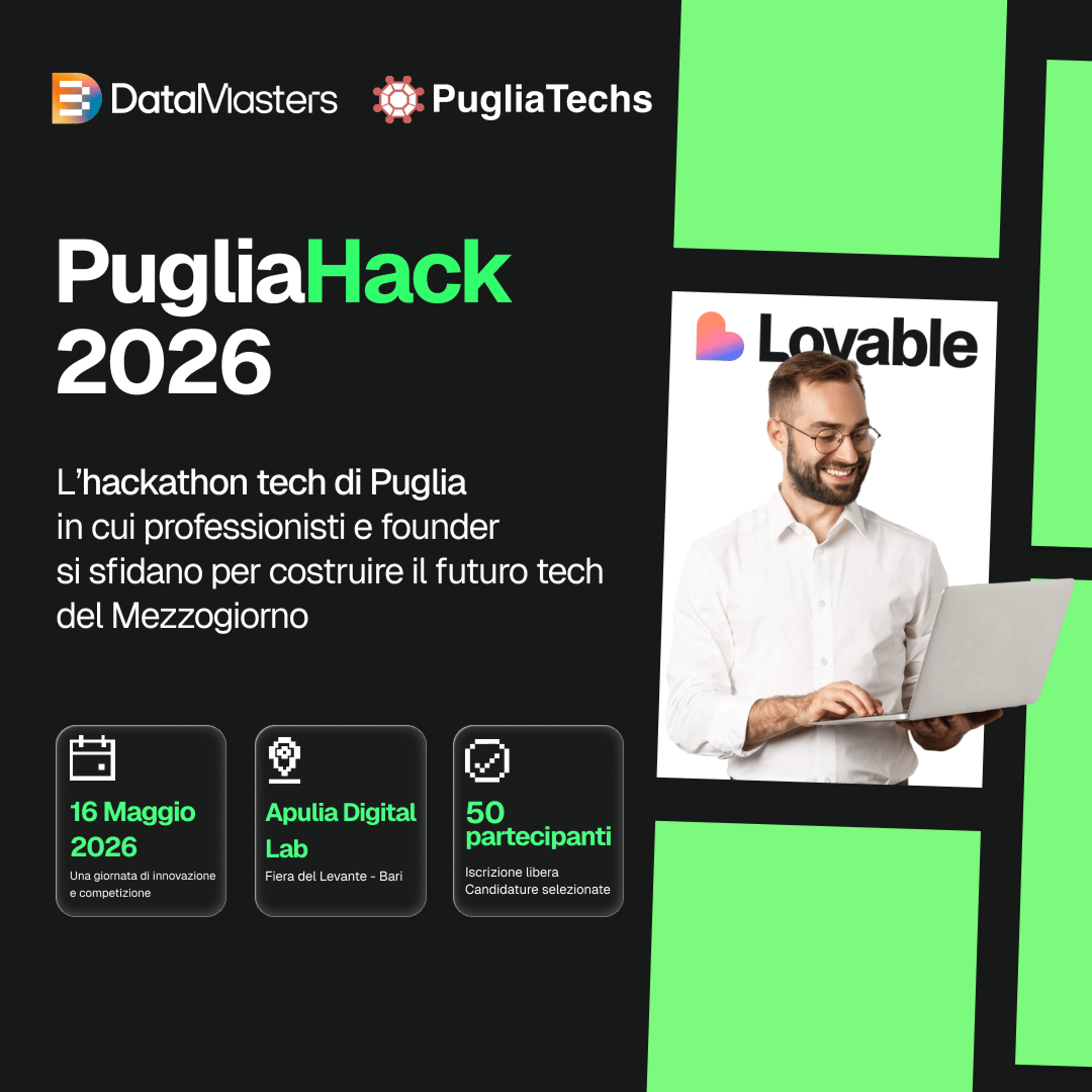 PugliaHack 2026 è un’iniziativa promossa da Data Masters in collaborazione con PugliaTechs APS per stimolare l’innovazione digitale attraverso strumenti di sviluppo assistiti dall’intelligenza artificiale. L’evento si rivolge a studenti, professionisti, aspiranti imprenditori, sviluppatori e designer: chiunque voglia trasformare un’idea in un’applicazione funzionante in tempi rapidi.