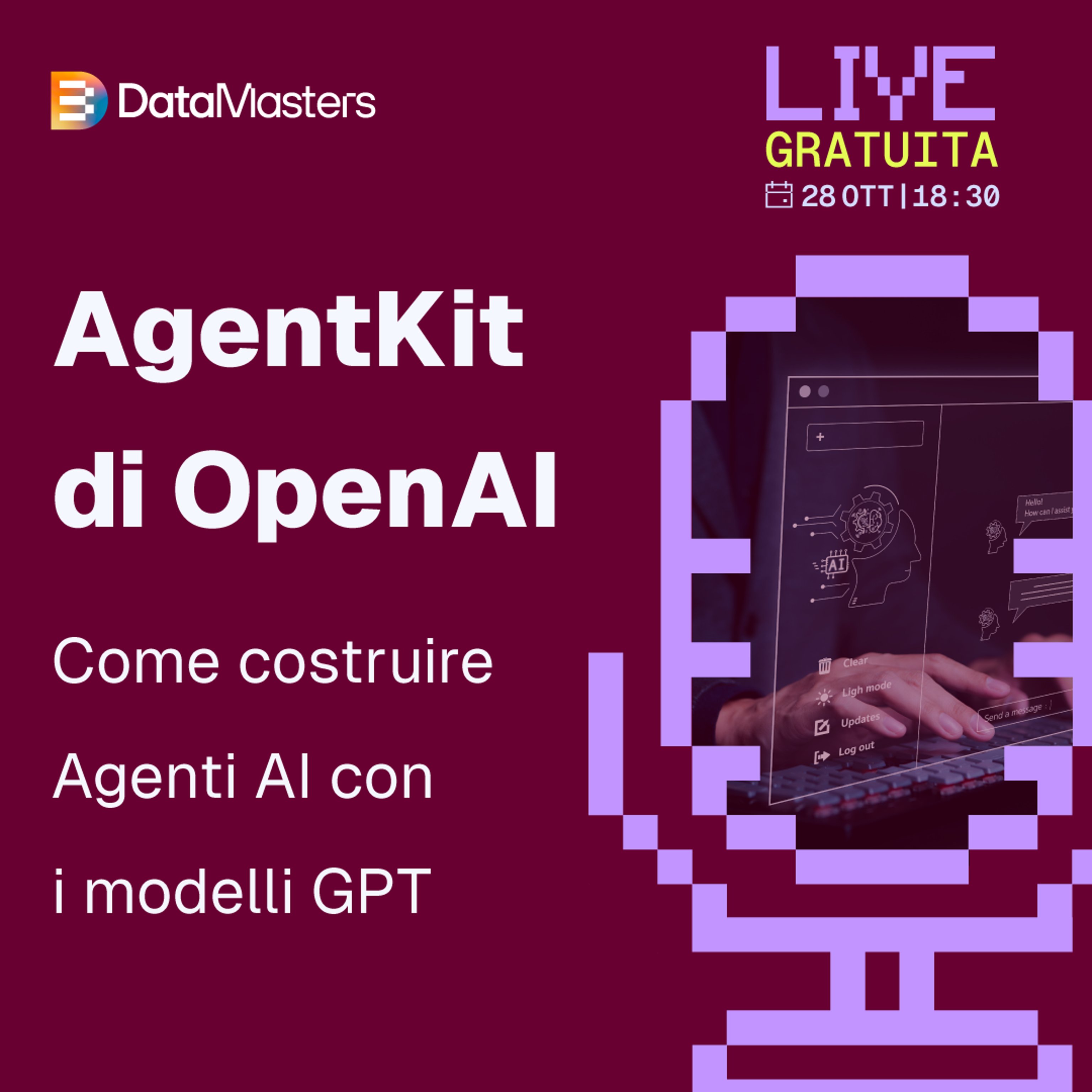 Unisciti a noi per questo webinar esclusivo con una demo pratica, in cui esploreremo AgentKit, la nuova frontiera di OpenAI che permette di creare e gestire Agenti AI personalizzati in modo scalabile e integrato.